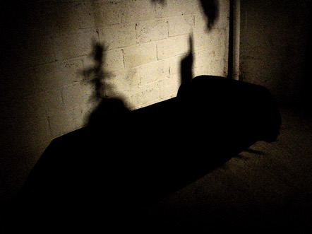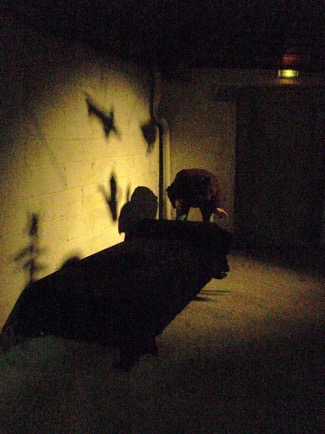 Ce dispositif met en scène certains “mirages” nocturnes de mon enfance engendrés par des phénomènes physiques ou fantasmagoriques (pulsations auriculaires, ombres portées, grande bête aspirante...)