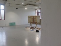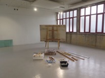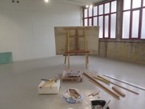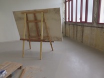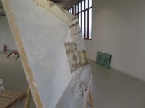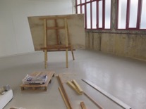 (Notes d’exposition) : “Installation d’un support de « tableau », avec le tableau. En plâtre et bois. Une sorte d’étayage (qui se transformera plus tard en chevalet, dont le modèle est celui des Ménines). Les matériaux ayant servi à sa construction sont laissés là (sacs de plâtre, bois, bassine, outils divers).