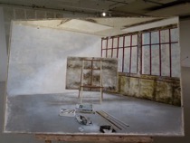 La peinture « rappelle » le point de vue qu’on a en arrivant. Elle montre son envers, et, finalement ne montre rien. C’est le processus du travail qui est dévoilé, le modus operandi.