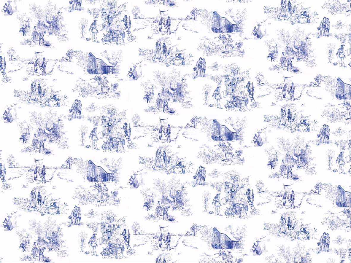 La Toile de Jouy, dont le motif de saynètes bucoliques et champêtres met en scène des personnages issus du peuple, est destinée dès l’origine à la grande bourgeoisie et à l’aristocratie.