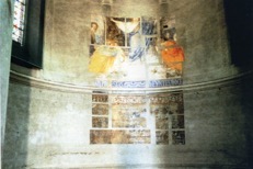 1: Comme dans la “Chambre” et l’ ”Atelier” (dont la trame de quadrilatères est reportée ici mais en anamorphose verticale), le principe de “retrait” est appliqué sur le mur du choeur de la Chapelle des Lazaristes à Tours, dont l’enduit cache une fresque de la Transfiguration. Par le procédé, celle-ci est donc partiellement mise à jour, et le motif révélé participe fortuitement au travail. Pas de ponçage ici, mais un travail au scalpel.