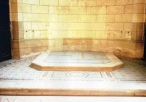 2: Des plaques de verre sablées sont déposées à même le sol dans les transepts, à l’emplacement d’anciens autels dont on voit l’empreinte fantôme au mur... Le sablage est une technique qui dépolit le verre par retrait de matière.