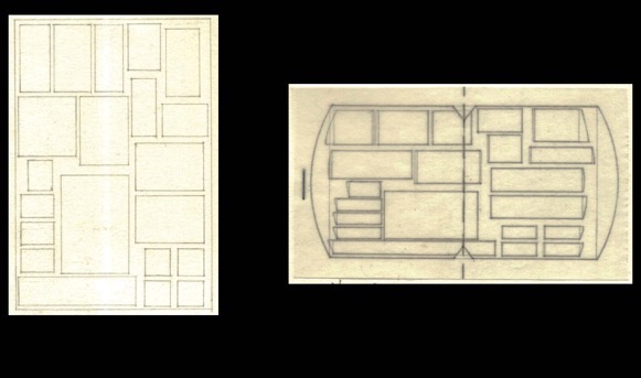 Par l’anamorphose, les formes se soumettent à la configuration d’un espace. Elles sont littéralement contraintes à adopter les contours de cet espace (cf les deux schémas ci-dessous). Initialement, dans la Chambre, ces formes ont été subjectivement choisies mais ensuite elles ne varient que mathématiquement.