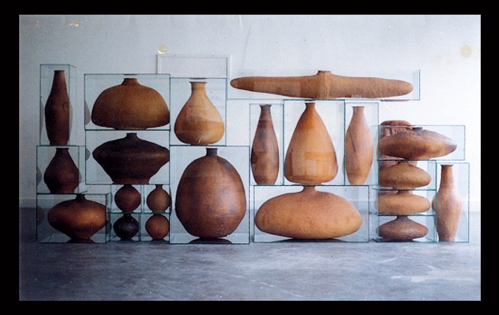 Les formats des vitrines reprennent la trame initiale de “Chambre”, et provoquent la forme des vases. Ceux-ci semblent “contraints” par leur réceptacle, puisqu’ils en ont exactement les dimensions.